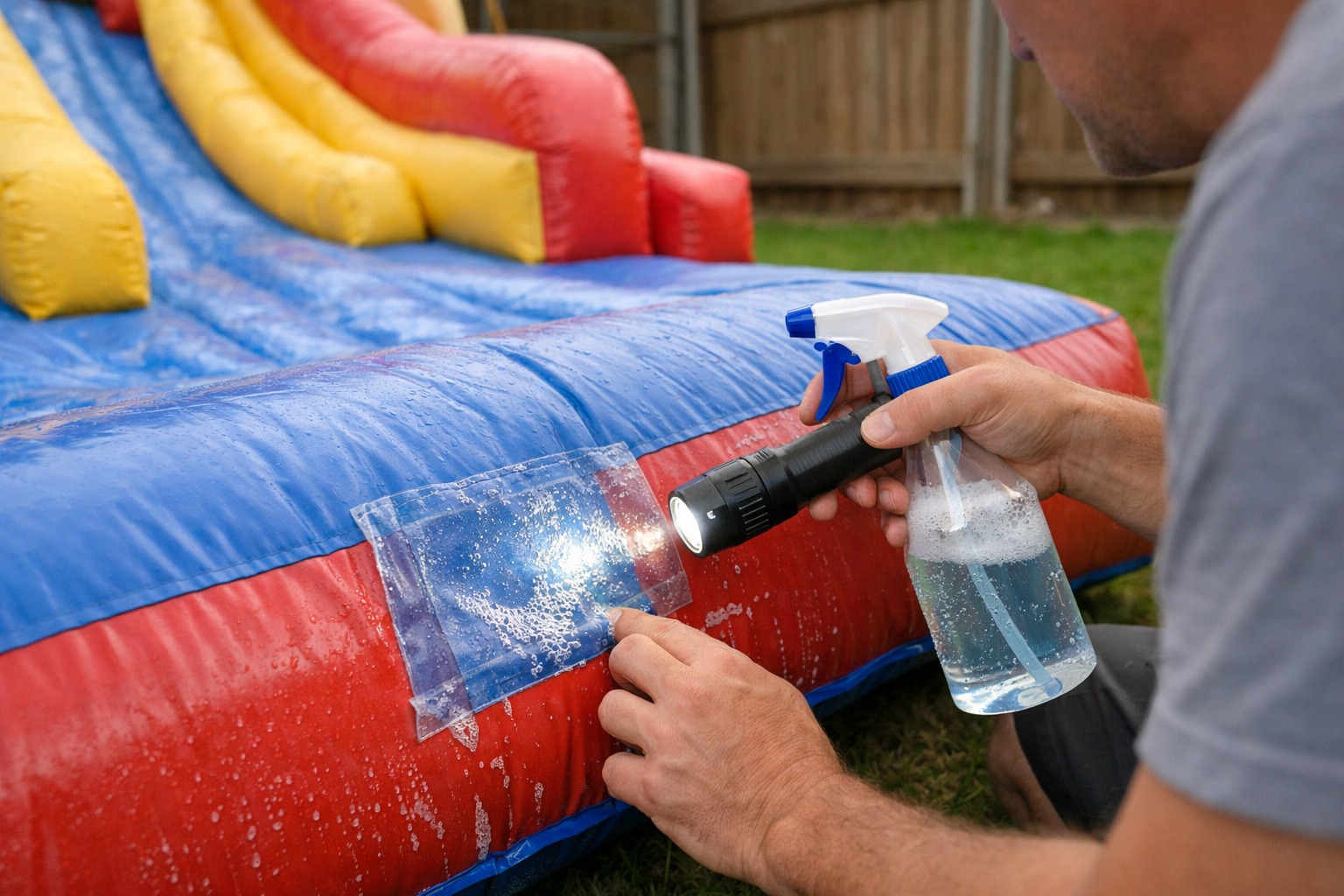 Când termini o reparație la un topogan gonflabil, tentația e să îl umfli, să îl vezi stând mândru în curte și să spui gata, am rezolvat. Așa am fost și eu prima dată, cu palma încă lipicioasă de la adeziv și cu mintea deja la următoarea treabă. Doar că un topogan gonflabil nu e o sacoșă pe care o peticești și ai uitat de ea, e o structură care ține oameni în mișcare, copii care sar, alunecă și se împing unii pe alții, fără să se gândească vreo secundă la cusături. Dacă ai făcut reparația, merită să faci și testul de etanșeitate, cu calm, ca să știi unde stai.